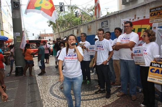 Representantes do Sindicato dos Bancários, da Associação dos Funcionários da Caixa Econômica (Apcef) e da Associação dos Gerentes da Caixa (Agcef) realizaram um ato na manhã desta sexta-feira, 27, em frente à agência Serigy localizada no Calçadão da rua João Pessoa. O objetivo foi reforçar a defesa do papel social da Instituição financeira.