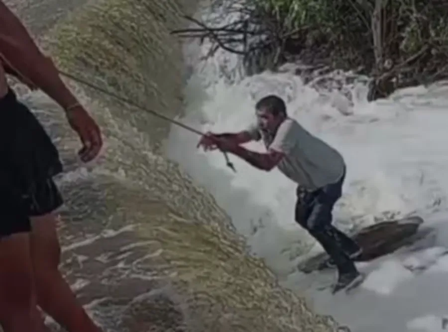 Imagens mostram o momento em que populares auxiliam o homem a sair da água. Segundo Vítor Hugo Aragão, filho da vítima, Edenilson Silveira — conhecido como 'seu Dilson' —, o pai tentava passar por uma travessia quando caiu em um buraco que estava submerso.