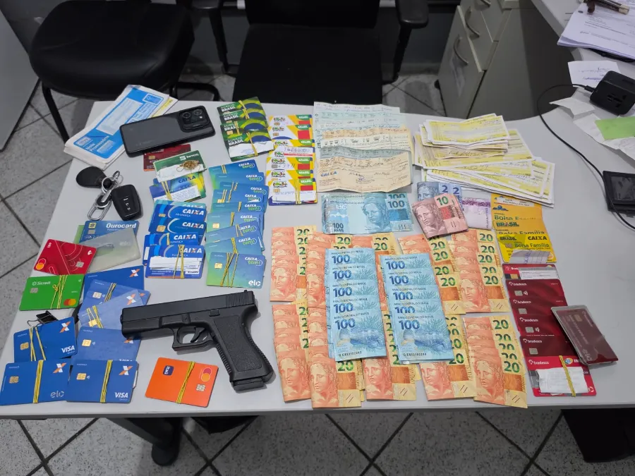 Durante a ação, foram apreendidos 53 cartões magnéticos de benefícios sociais e de instituições bancárias, mais de R$ 2 mil em espécie, um simulacro de arma de fogo, além de cheques e notas promissórias assinadas por vítimas.