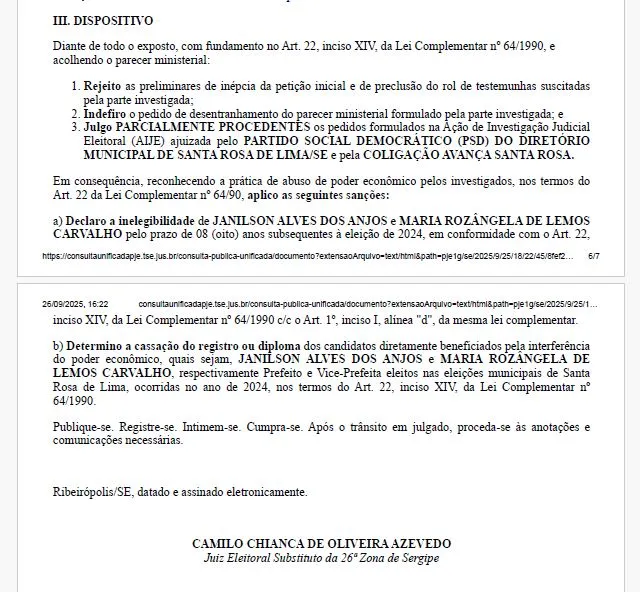 O Tribunal Regional Eleitoral de Sergipe determinou nesta sexta-feira, 26 de setembro de 2025, a cassação do diploma do prefeito Janilson Alves dos Anjos e da vice-prefeita Maria Rozângela de Lemos Carvalho, eleitos em 2024 em Santa Rosa de Lima. A decisão decorre de uma Ação de Investigação Judicial Eleitoral (AIJE) que apontou abuso de poder econômico durante o evento “São Pedro da Brasília”, realizado em 29 de julho de 2024 no bairro Brasília, com distribuição de cestas básicas, comidas típicas e shows, considerados pela Justiça como estratégia para influenciar o voto da população.