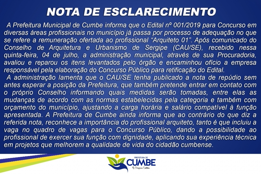 A Prefeitura Municipal de Cumbe informa que o Edital nº 001/2019 para concurso em diversas áreas profissionais no município já passa por processo de adequação no que se refere a remuneração ofertada ao profissional “Arquiteto 01”. Após comunicado do Conselho de Arquitetura e Urbanismo de Sergipe (CAU/SE), recebido nessa quinta-feira, 04 de julho, a administração municipal, através de sua Procuradoria, avaliou e reparou os itens levantados pelo órgão e encaminhou ofício a empresa responsável pela elaboração do Concurso Público para retificação do Edital.